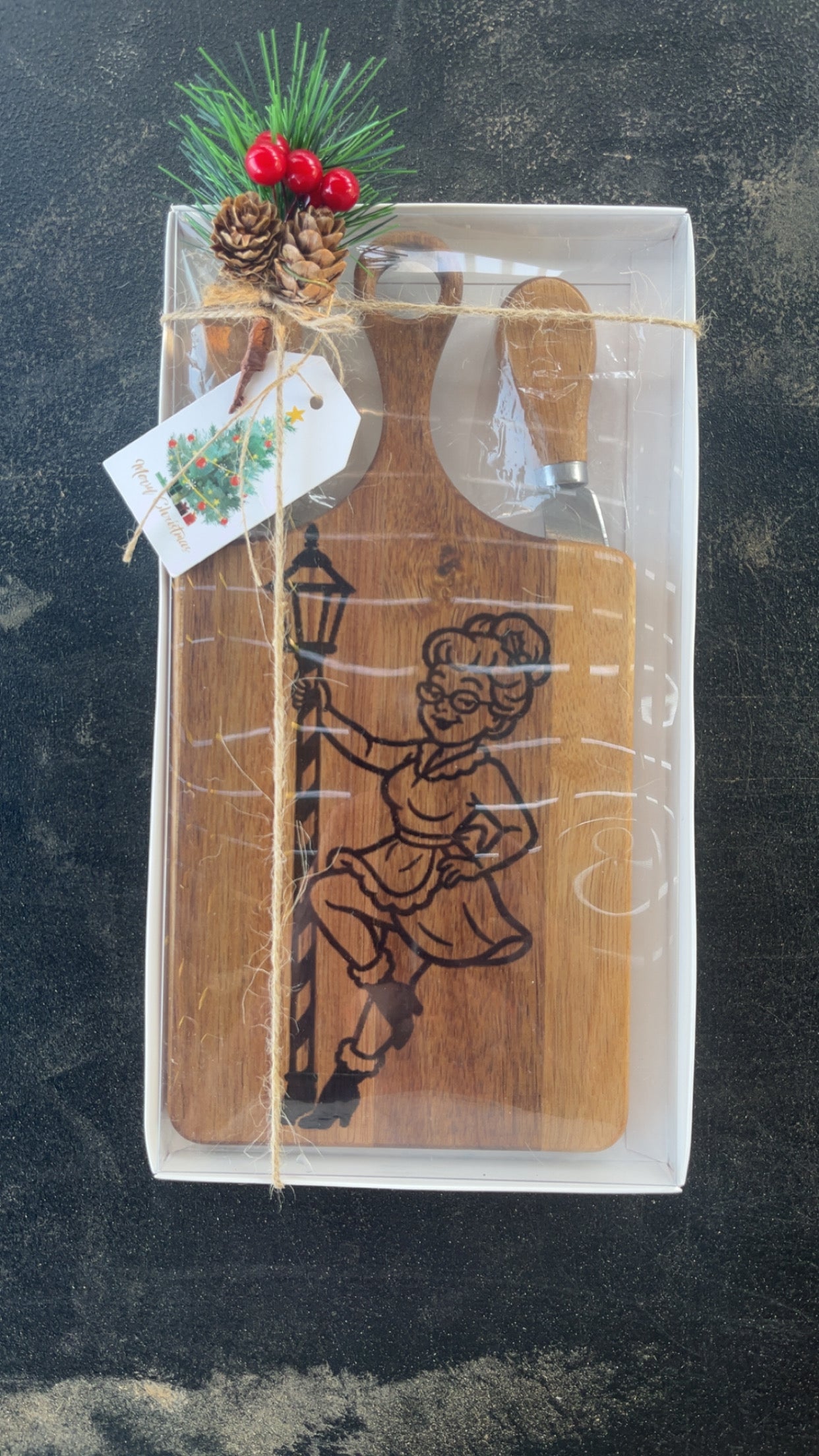 BOX 5x10 inches. Complete with two serving utensils Custom burnt wooden board perfect for display or kitchen decor. (please note, wood coloring and appearance vary from board to board) **all boards are finished with a coat of food grade mineral oil.