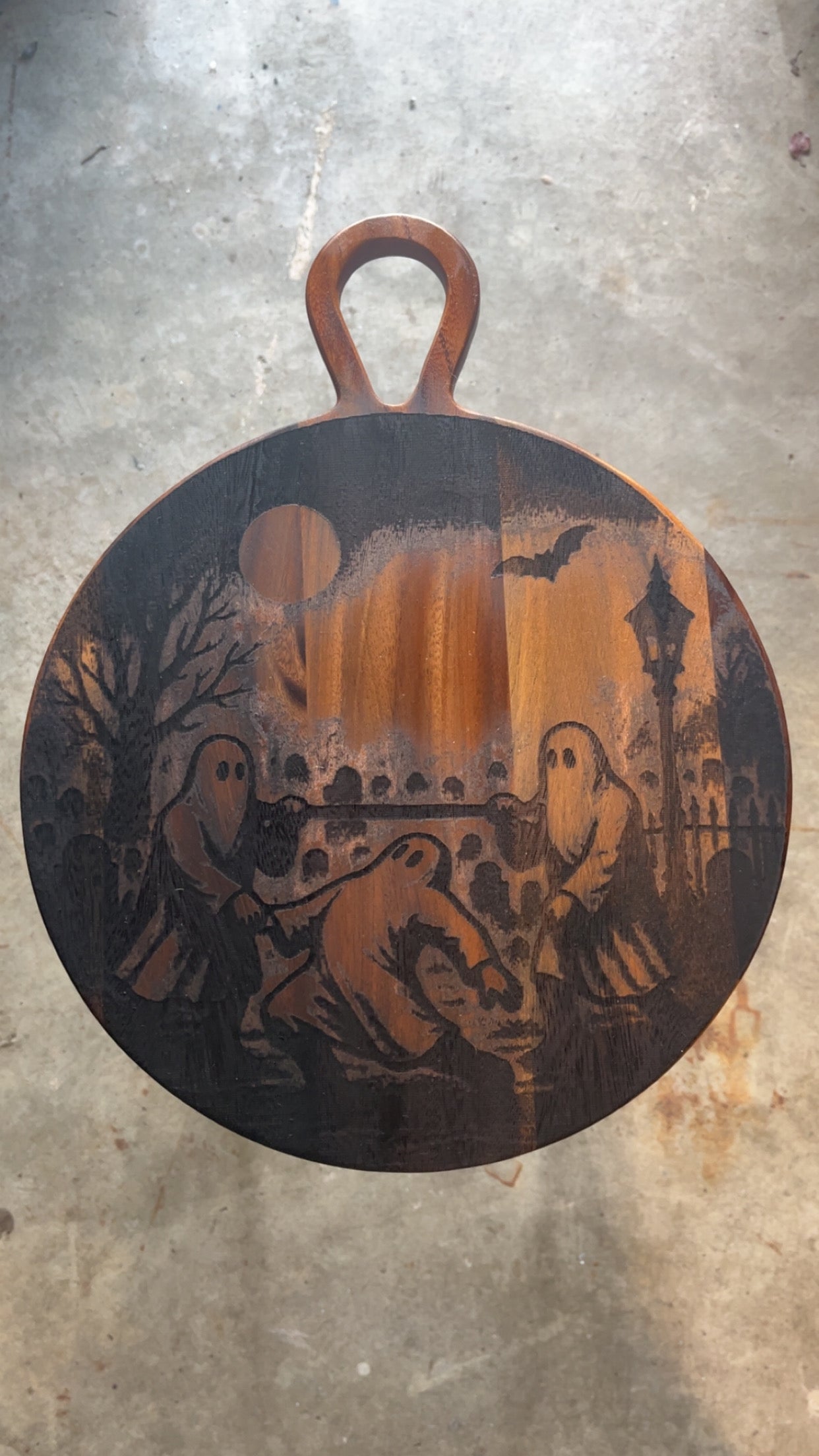 15in round by 1/2 inch thick( 18 inches tall including handle) Custom burnt wooden board perfect for display or kitchen decor. (please note, wood coloring and appearance vary from board to board) **all boards are finished with a coat of food grade mineral oil.