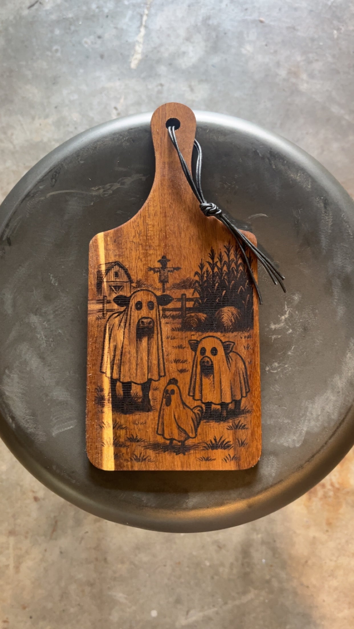 5x7 inches (11 with handle) Custom burnt wooden board perfect for display or kitchen decor. (please note, wood coloring and appearance vary from board to board) **all boards are finished with a coat of food grade mineral oil.