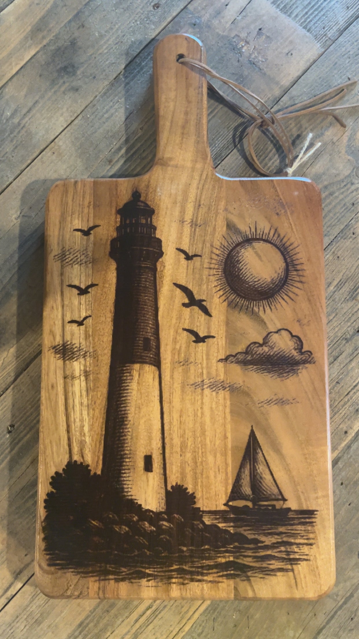 10x14x1in (20 inches tall including handle) Custom burnt wooden board perfect for display or kitchen decor. This image is a replica of the Barnegat Lighthouse found in Barnegat Bay New Jersey right on Long Beach Island. (please note, wood coloring and appearance vary from board to board) **all boards are finished with a coat of food grade mineral oil.