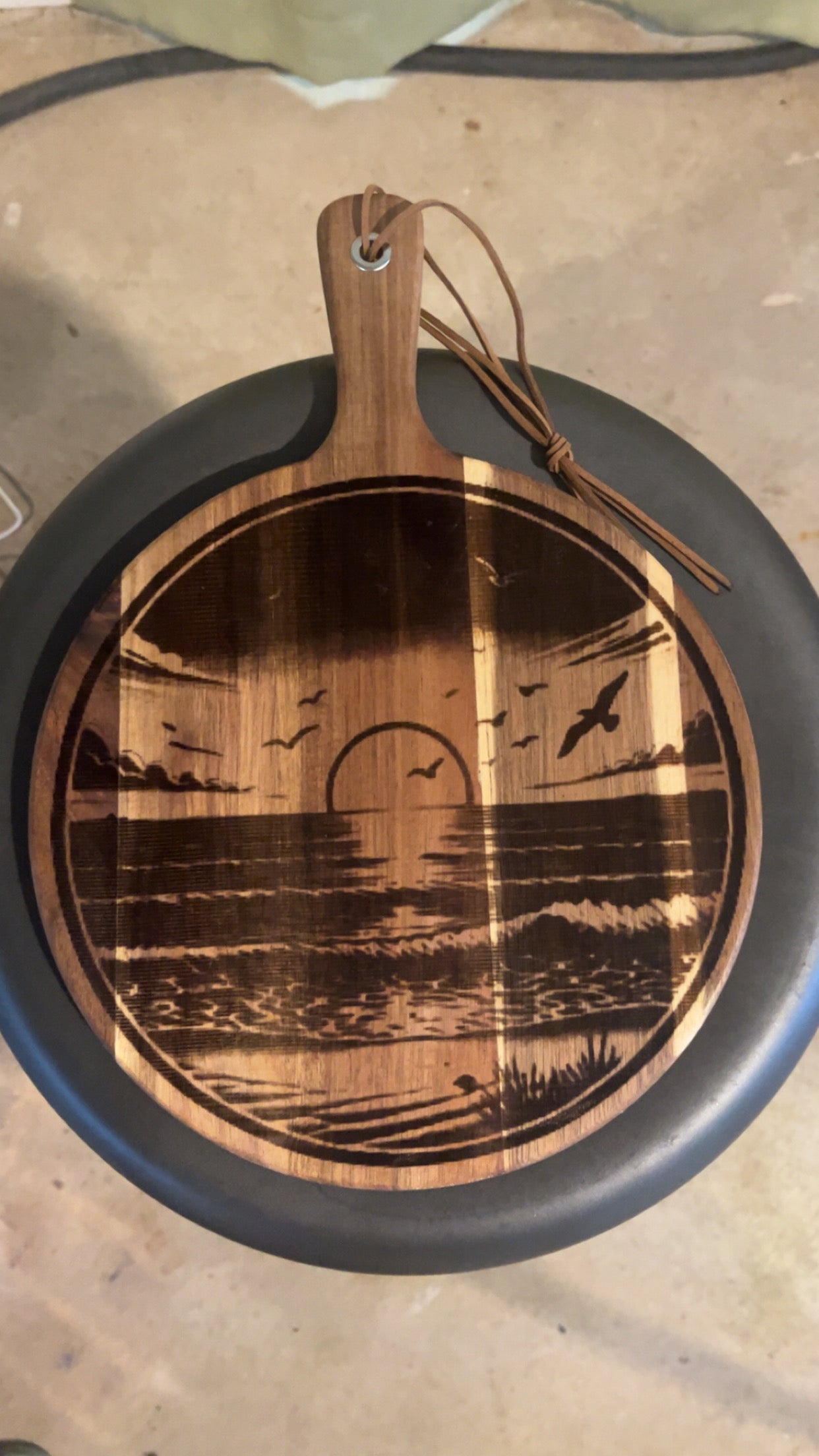 10in round (13.5 inches tall including handle) Custom burnt wooden board perfect for display or kitchen decor. (please note, wood coloring and appearance vary from board to board) **all boards are finished with a coat of food grade mineral oil.